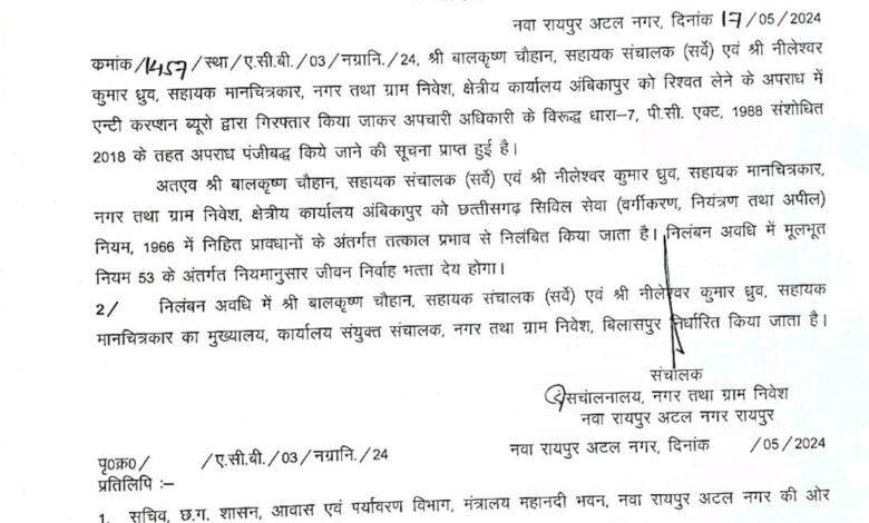 संचालनालय नगर तथा ग्राम निवेश कार्यालय से जारी आदेश अनुसार इन दोनों के विरूद्ध रिश्वत लेने के अपराध में एन्टी करप्शन ब्यूरो द्वारा गिरफ्तार किया जाकर अपचारी अधिकारी के विरूद्ध धारा-7, पी.सी. एक्ट, 1988 संशोधित 2018 के तहत अपराध पंजीबद्ध किये जाने की सूचना प्राप्त हुई थी। अतएव बालकृष्ण चौहान, सहायक संचालक (सर्वे) एवं नीलेश्वर कुमार ध्रुव, सहायक मानचित्रकार, नगर तथा ग्राम निवेश, क्षेत्रीय कार्यालय अंबिकापुर को छत्तीसगढ़ सिविल सेवा (वर्गीकरण, नियंत्रण तथा अपील) नियम, 1966 में निहित प्रावधानों के अंतर्गत तत्काल प्रभाव से निलंबित किया गया है। निलंबन अवधि में मूलभूत नियम के अंतर्गत नियमानुसार जीवन निर्वाह भत्ता देय होगा। निलंबन अवधि में बालकृष्ण चौहान, सहायक संचालक (सर्वे) एवं नीलेश्वर कुमार ध्रुव, सहायक मानचित्रकार का मुख्यालय, कार्यालय संयुक्त संचालक, नगर तथा ग्राम निवेश, बिलासपुर निर्धारित किया जाता है।