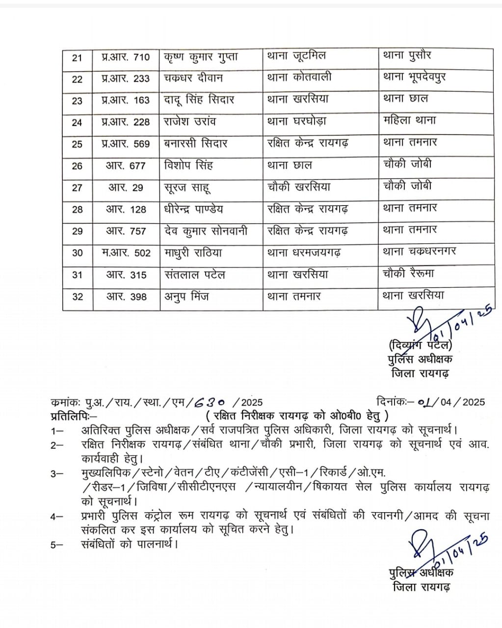 CG Police Transfer: SP दिव्यांग पटेल ने 11 निरीक्षकों सहित किया 32 पुलिसकर्मियों का तबादल आदेश जारी, देखें लिस्ट…