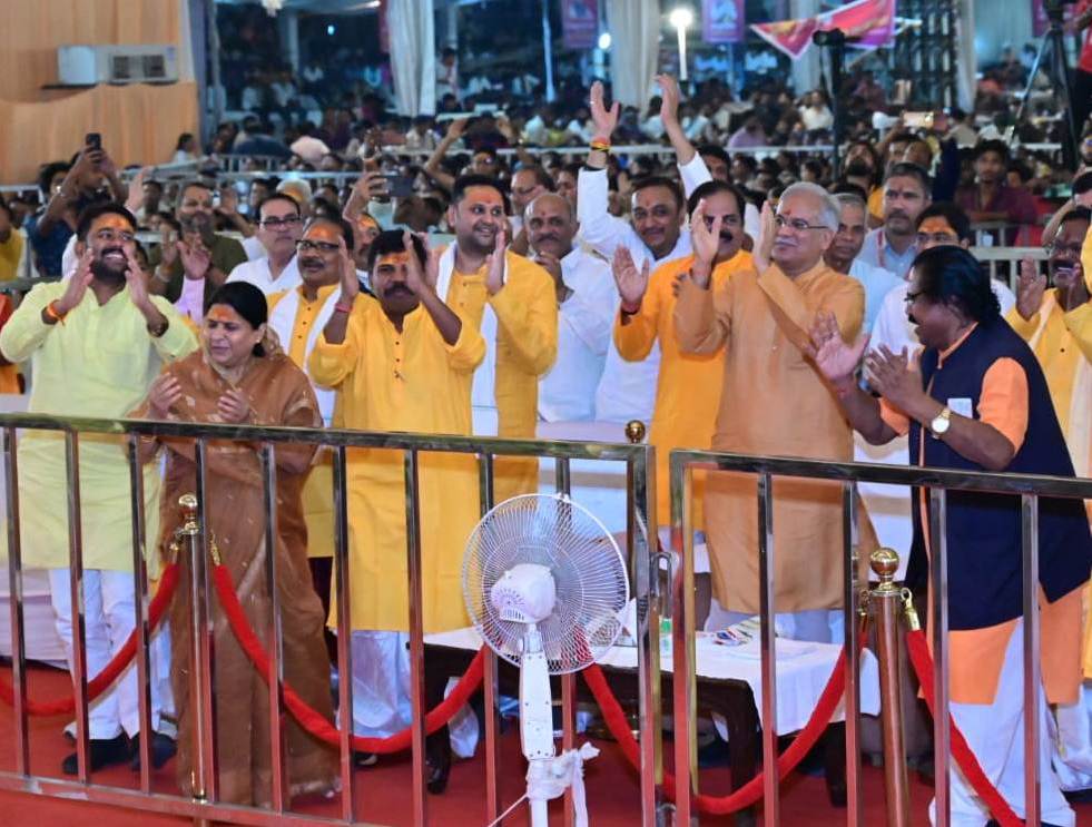 मुख्यमंत्री भूपेश बघेल और अतिथियों ने मंच पर पहुंचकर सुश्री मैथिली ठाकुर को पुष्पगुच्छ एवं रामचरित मानस की प्रति भेंटकर सम्मानित किया।
