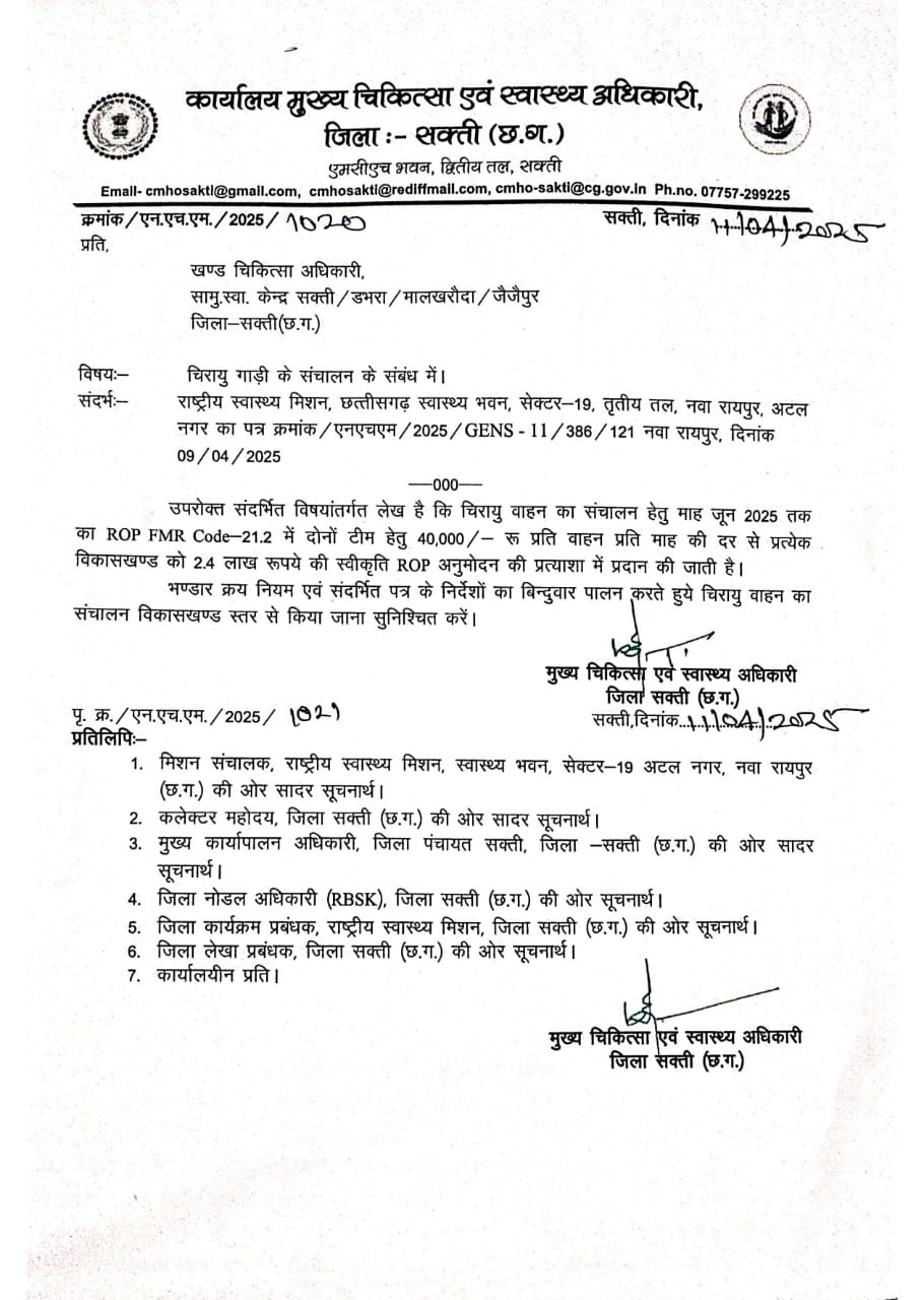 अप्रैल माह में सभी बीएमओ को सीएमएचओ कार्यालय से पत्र जारी कर चिरायु योजना की राशि की स्वीकृति ओर योजना के संचालन की जिम्मेदारी दे दी गई थी जिसमें सक्ती बीएमओ ने वाहन मालिकों को भुगतान नहीं किया है ऐसी जानकारी मिली है इसकी जांच करा रहे है वहीं एक पत्र ओर सभी बीएमओ को भेजा जा गया है जिसमें वाहन का टेंडर होने तक ओर कर्मचारियों का हड़ताल खत्म होने तक चिरायु योजना के संचालन के लिए वैकल्पिक व्यवस्था करने के लिए कहा गया है।