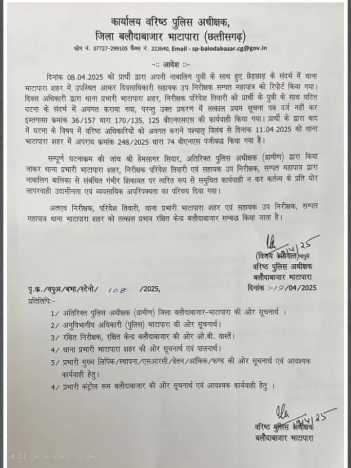भाटापारा। भाटापारा शहर थाना क्षेत्र में एक नाबालिग बच्ची के साथ छेड़छाड़ के गंभीर मामले में लापरवाही बरतने पर थाना प्रभारी प्रवेश तिवारी और उप निरीक्षक को तत्काल प्रभाव से हटाकर लाइन अटैच कर दिया गया है। यह कार्रवाई जिला पुलिस अधीक्षक बलौदाबाजार-भाटापारा द्वारा की गई है। मिली जानकारी अनुसार घटना कुछ इस तरह से है की 8 अप्रैल 2025 को पीड़ित पक्ष द्वारा नाबालिग के साथ छेड़छाड़ की शिकायत दर्ज कराई गई थी। इस मामले में एक्शन लेने में थाना भाटापारा शहर द्वारा ढिलाई बरती गई।