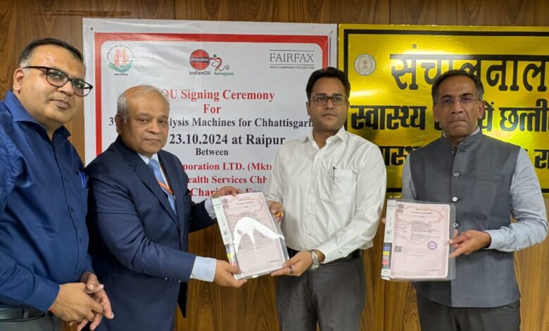 रायपुर। प्रधानमंत्री राष्ट्रीय डायलिसिस कार्यक्रम के अंतर्गत आज स्वास्थ्य एवं परिवार कल्याण विभाग, इंडियन आयल कार्पोरेशन एवं फेयरफैक्स इंडिया चैरिटेबल फाउंडेशन ने एक एमओयू पर हस्ताक्षर किया है। इस एमओयू के अनुसार स्वास्थ्य विभाग को इंडियन आयल कार्पोरेशन के द्वारा अगले एक माह में 39 डायलिसिस मशीनें प्राप्त होंगी। स्वास्थ्य विभाग को यह मशीनें यह मशीनें निःशुल्क प्राप्त होंगी तथा इसकी मरम्मत व देखरेख फेयरफैक्स इंडिया चैरिटेबल फाउंडेशन के द्वारा किया जायेगा।