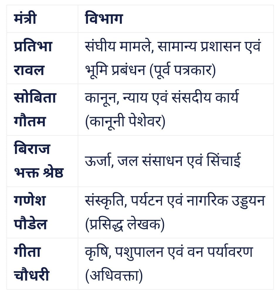 प्रधानमंत्री बालेन शाह ने अपनी 14 सदस्यीय कैबिनेट में अनुभवी अर्थशास्त्रियों और युवा चेहरों को जगह दी है। मंत्रिमंडल की मुख्य विशेषताएं इस प्रकार हैं: